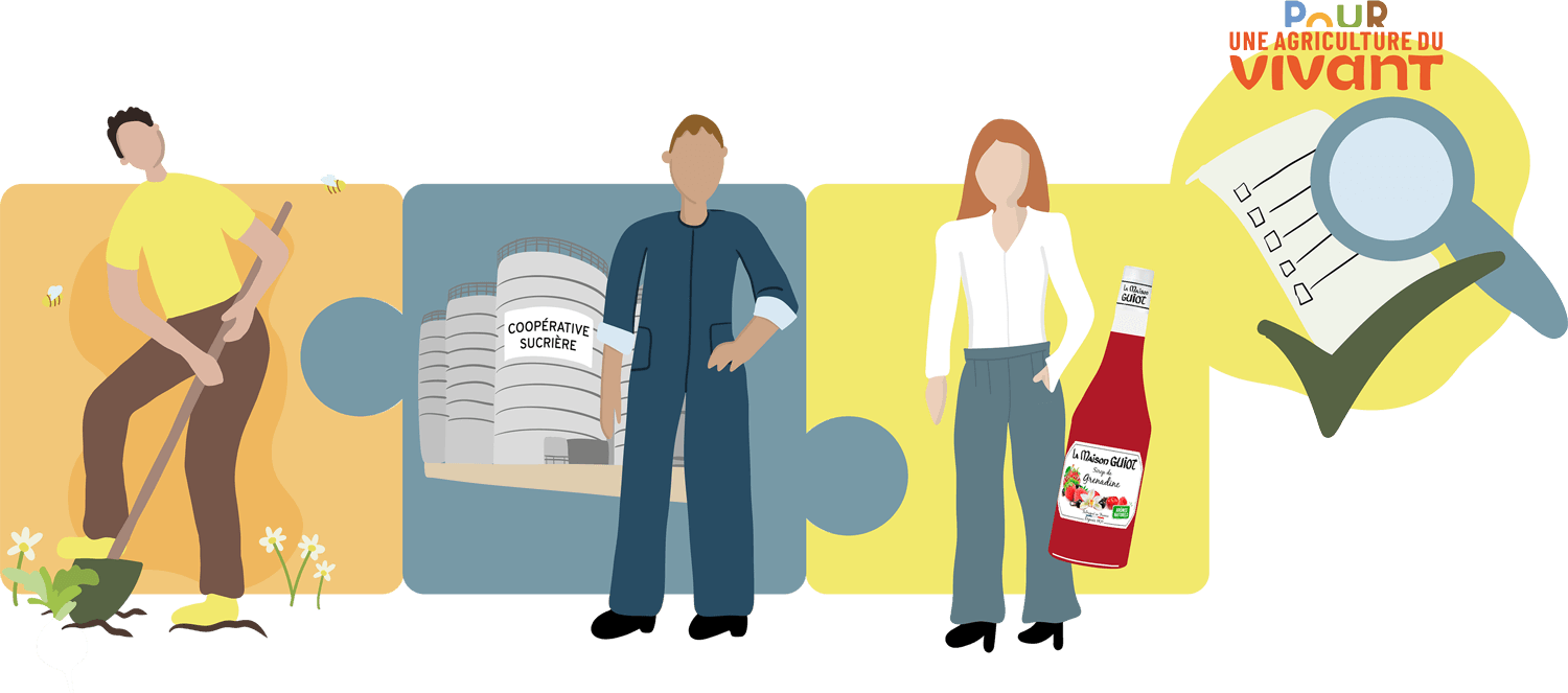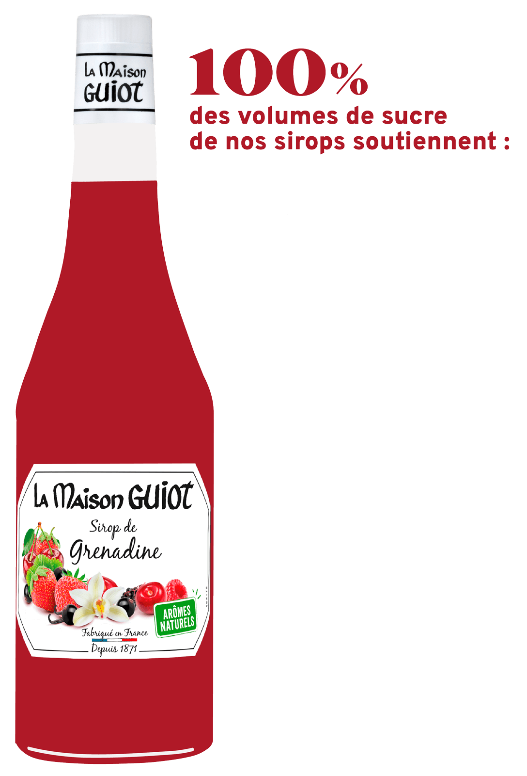 Aujourd’hui, La Maison GUIOT, entreprise française et familiale, vous propose de vous engager auprès des agriculteurs en faveur d’une agriculture plus durable pour répondre aux défis climatiques de demain. Pour cela, il suffit de choisir une bouteille de nos sirops.